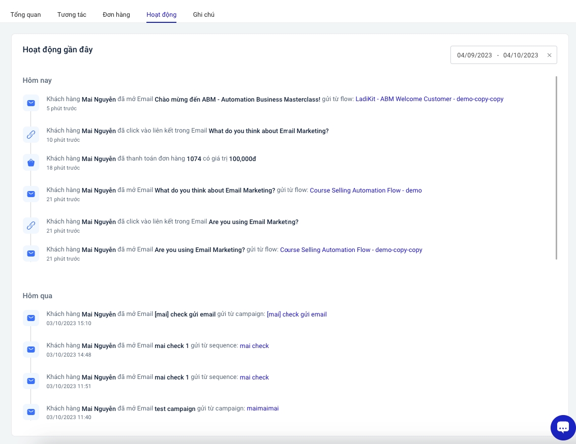 Bạn có thể theo dõi hoạt động của khách hàng theo khoảng thời gian mong muốn.