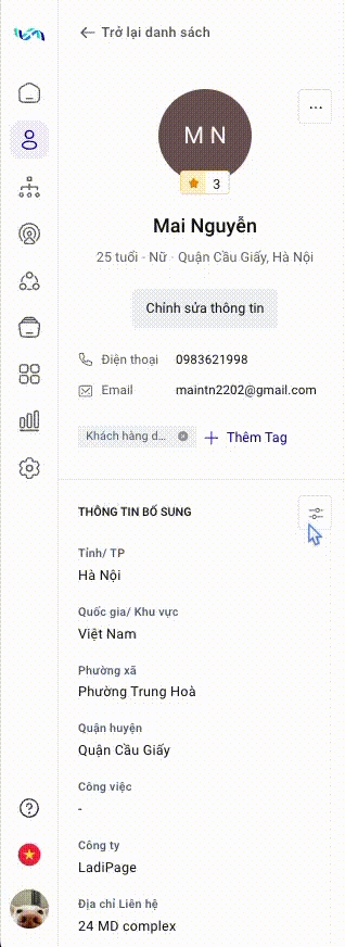 Các thông tin của khách hàng được hiển thị phía bên trái màn hình theo chiều dọc.