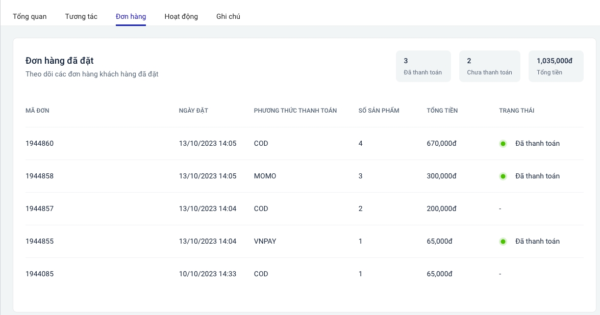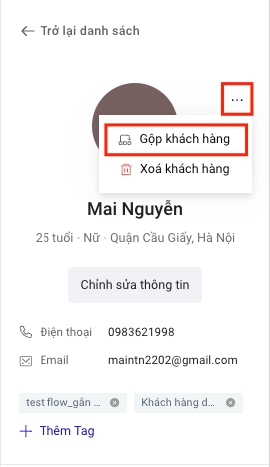 - Lịch sử đơn hàng, tương tác của 2 khách hàng sẽ được gom lại.