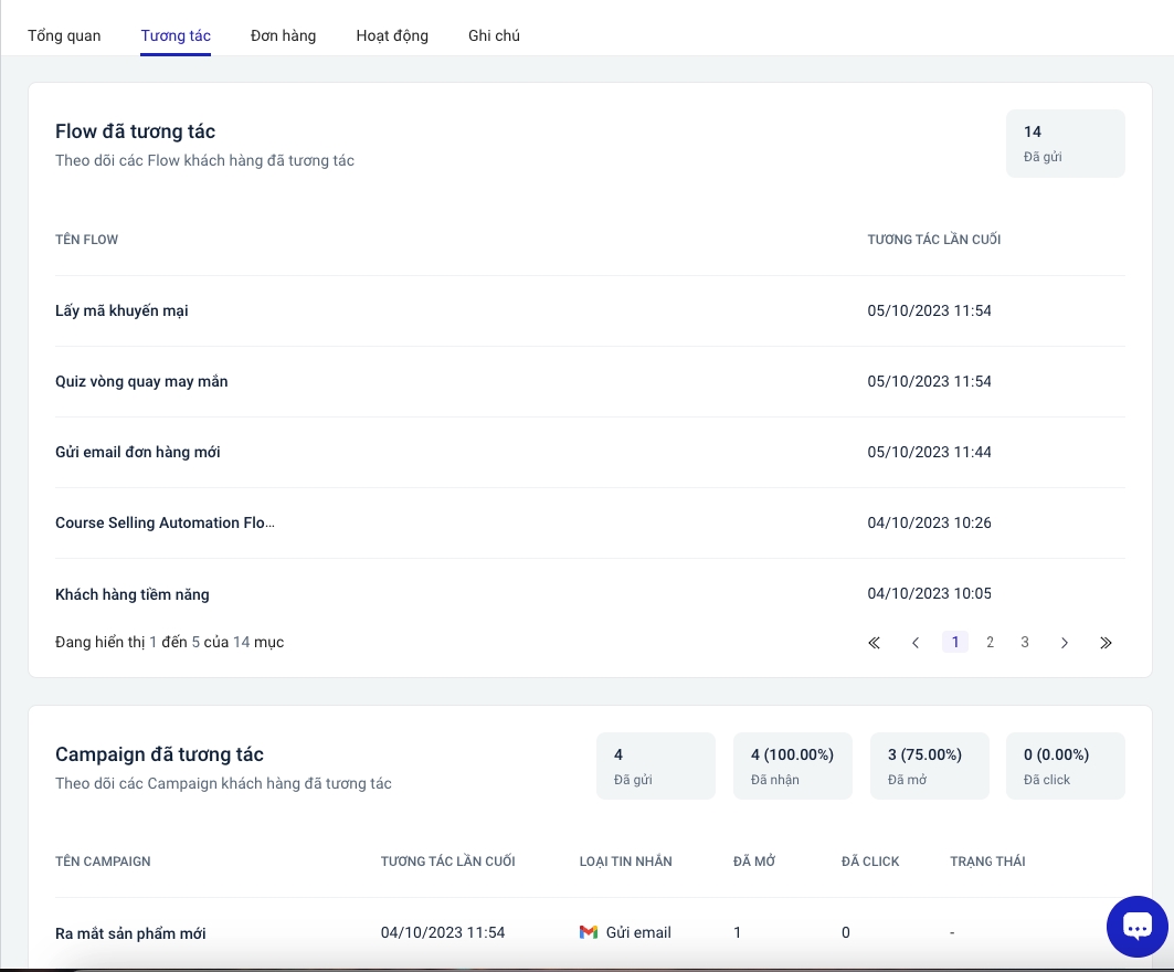 Bạn có thể xem thống kê chi tiết các tương tác của từng khách hàng trên Flow, Sequence, Campaign.