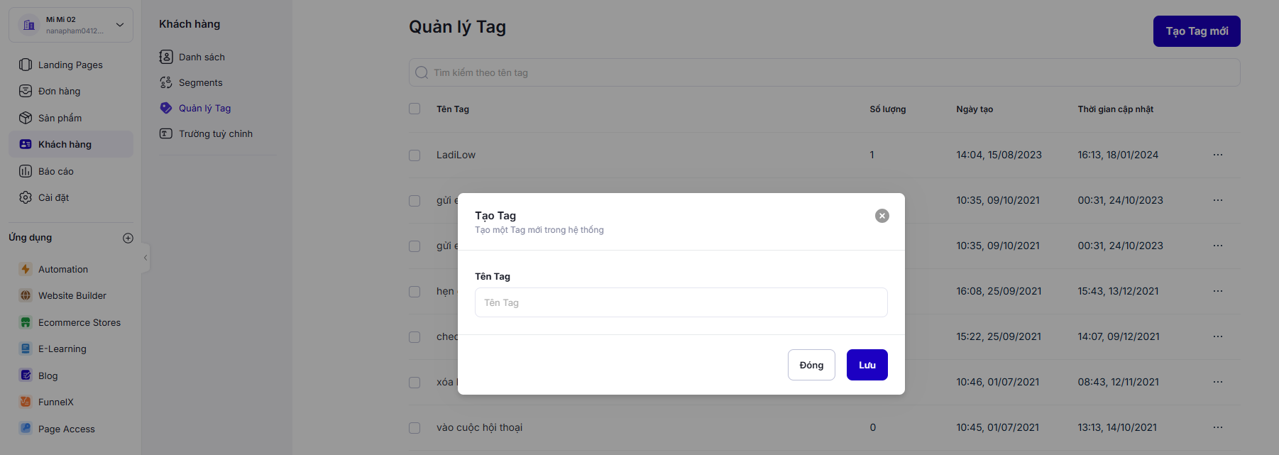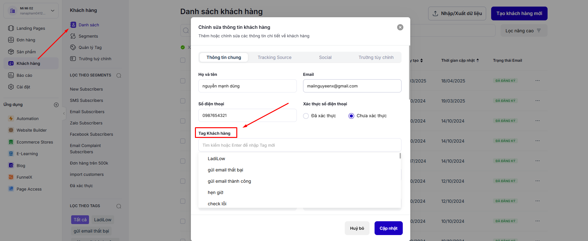 <figure><img src="https://1206056511-files.gitbook.io/~/files/v0/b/gitbook-x-prod.appspot.com/o/spaces%2FMhzSb2lqVdrrRcaVOf97%2Fuploads%2FEaGZXrsbV7sCRZotHQvZ%2Fimage.png?alt=media&#x26;token=566a06d1-debd-4fd3-95ac-6c8f6a287a80" alt=""><figcaption><p>Thêm Tag cho khách hàng </p></figcaption></figure>