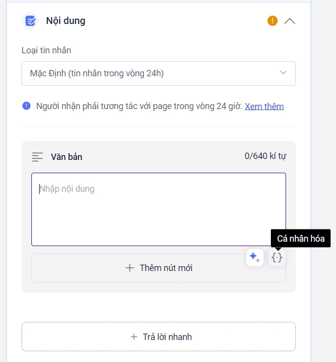 - Tại khu vực thiết lập tin nhắn, nút chọn vào biểu tượng Cá nhân hóa: