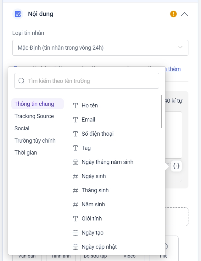 - Bạn có thể điền giá trị mặc định, format trường ngày tháng. Giá trị mặc định sẽ được gửi trong tin nhắn nếu trường dữ liệu bạn chọn không có giá trị