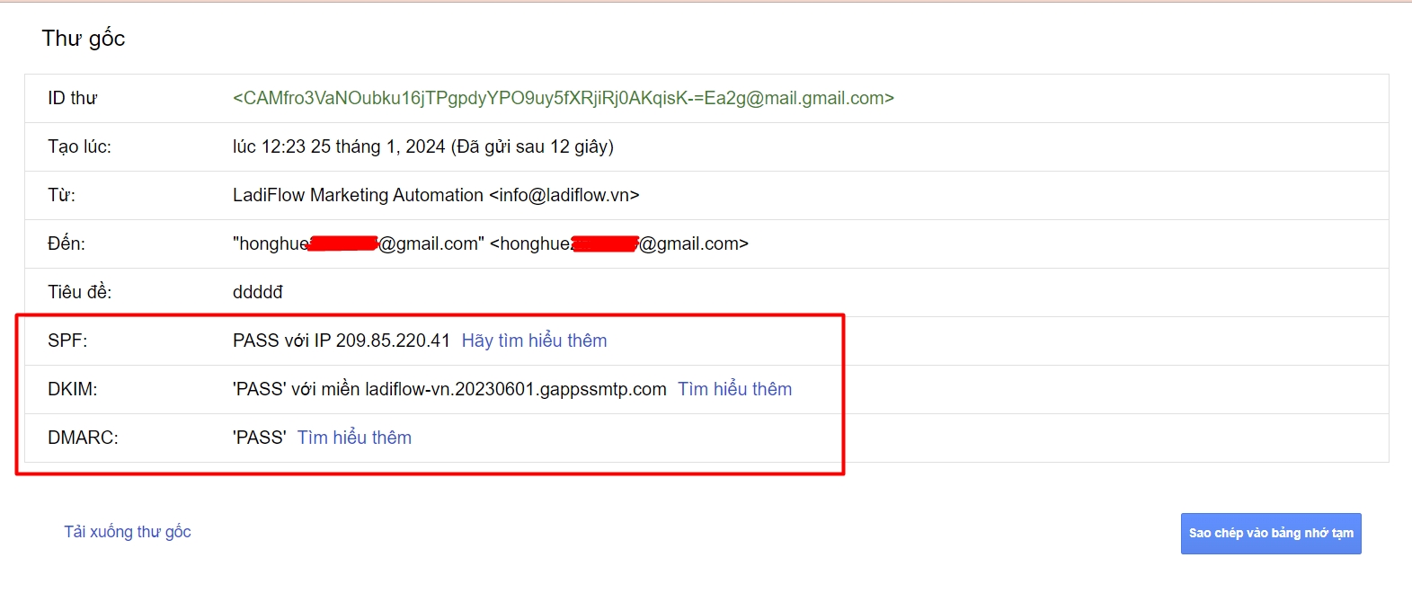 Sau khi tạo bản ghi, bạn chờ ít nhất 5 phút để bản ghi áp dụng. Sau đó thực hiện kiểm tra bằng cách gửi thử 1 email. Sau đó chọn Hiển thị thư gốc