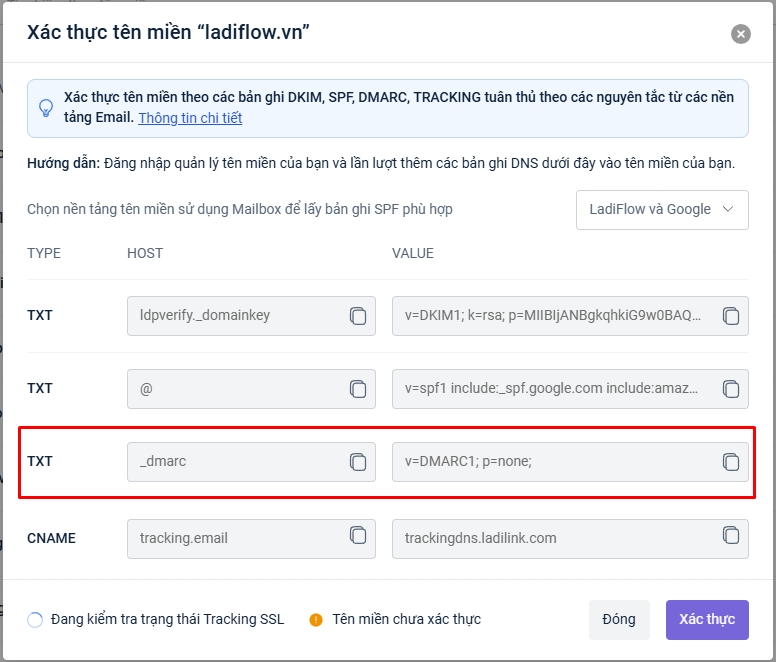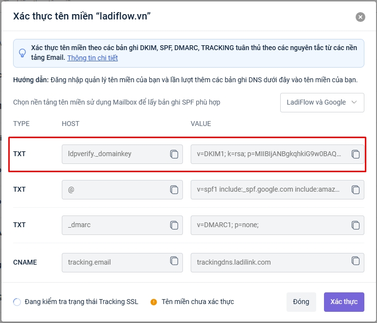 Cấu hình bản ghi SPF đã có của LadiFlow