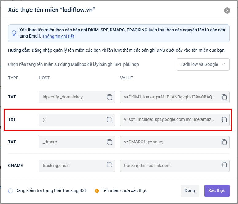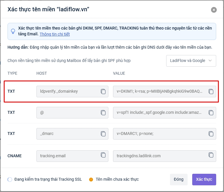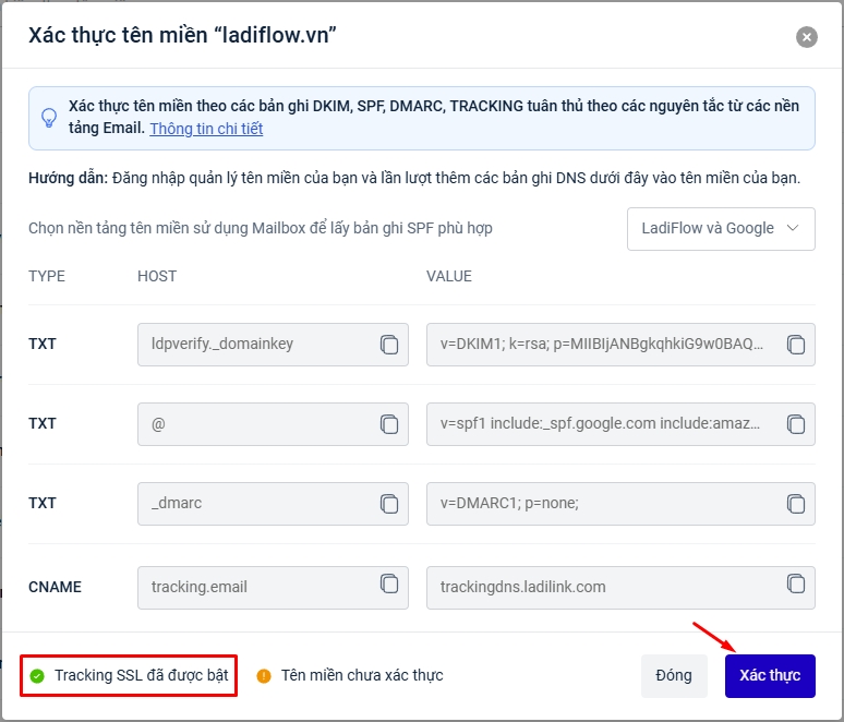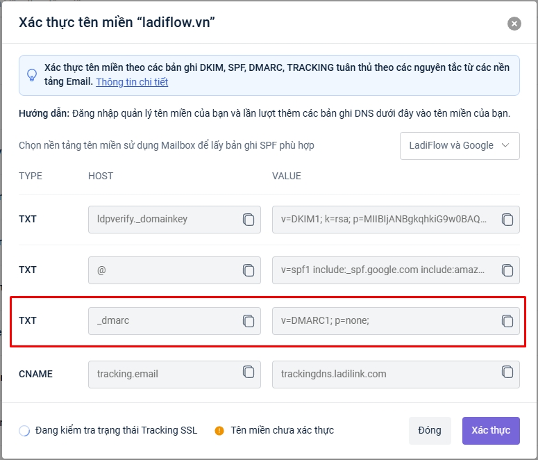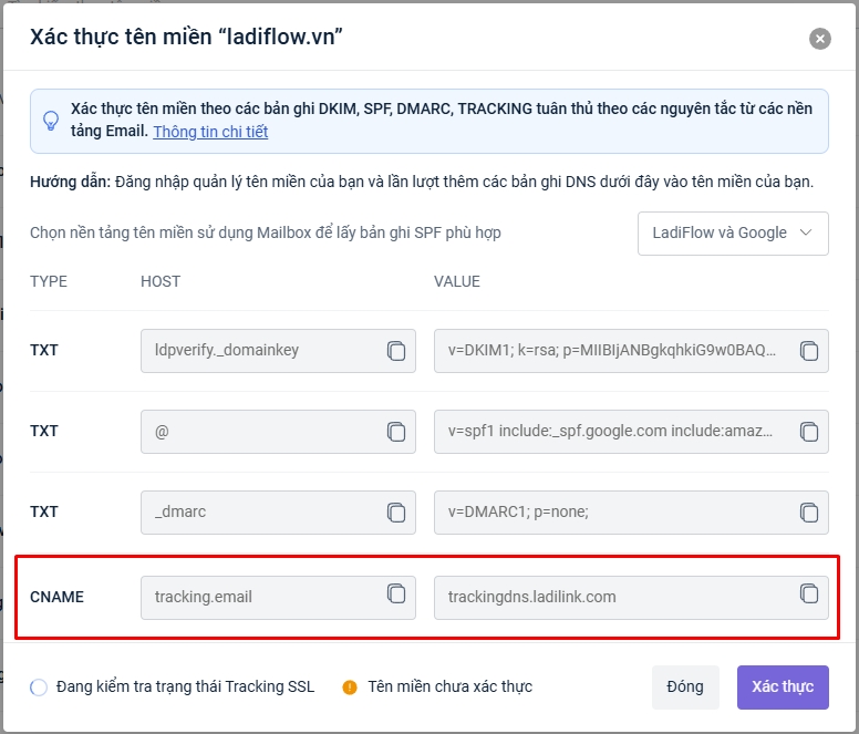 Ngoài các bản ghi xác thực tên miền theo 3 phương thức ở trên, LadiFlow còn cung cấp bản ghi Tracking nhằm: