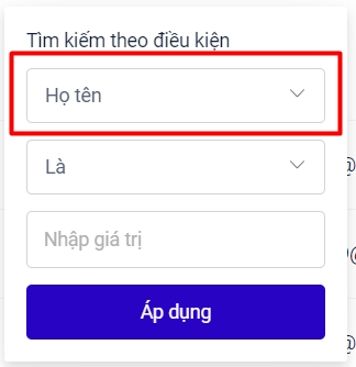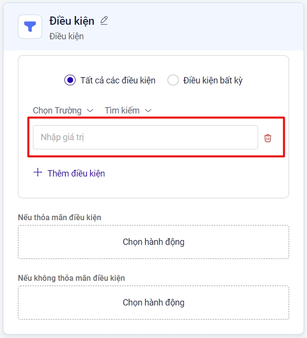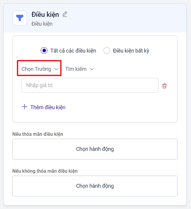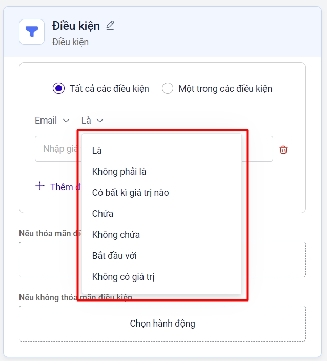- Trường so sánh: Là trường thông tin trong biểu thức điều kiện dùng để so sánh với Giá trị so sánh theo toán tử với công thức: <Trường so sánh> <toán tử> <Giá trị so sánh>. Đây là các trường trong dữ liệu khách hàng.  - Trường so sánh trong hành động Điều kiện  - Trường so sánh trong bộ lọc nâng cao