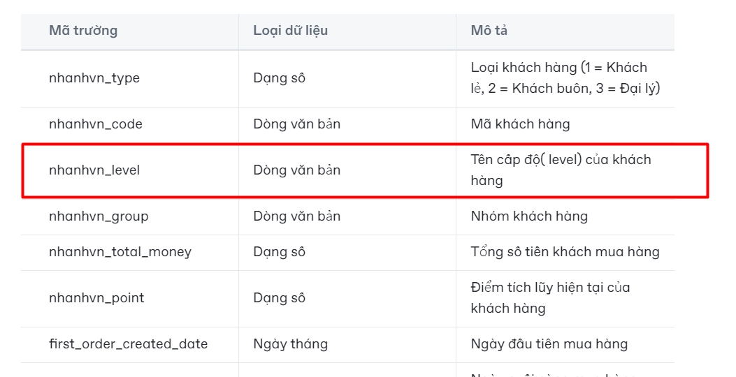 - Kiểm tra dữ liệu Hạng và tổng chi tiêu đã có trên khách hàng của bạn chưa - Dữ liệu Hạng: nếu thông tin khách hàng chưa có, hãy kiểm tra các mã trường tùy chỉnh tại nền tảng tích hợp đổ dữ liệu khách hàng(nếu có), danh sách các mã trường dữ liệu đã được liệt kê trên help của từng nền tảng tích hợp. Nếu có mã dữ liệu hạng thành viên, hãy tạo mã trường tùy chỉnh tương ứng. Nếu không có, cần nhập file dữ liệu bổ sung hoặc chạy kịch bản bổ sung dữ liệu. - Dữ liệu tổng chi tiêu: Tổng chi tiêu là trường dữ liệu Tổng giá trị đơn hàng  - Mã trường tùy chỉnh hạng khách hàng trên Nhanhvn