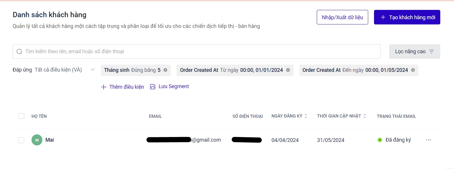 - Phân tách điều kiện thành các điều kiện đơn lẻ: - Điều kiện 1: Tháng sinh là 5 - Điều kiện 2: Ngày tạo đơn cuối từ ngày 0:00 01/01/2024 - Điều kiện 3: Ngày tạo đơn cuối đến ngày 24:00 30/04/2024, tương đương với 0:00 01/05/2024 - Mối quan hệ giữa các điều kiện: Và(Tất cả điều kiện)