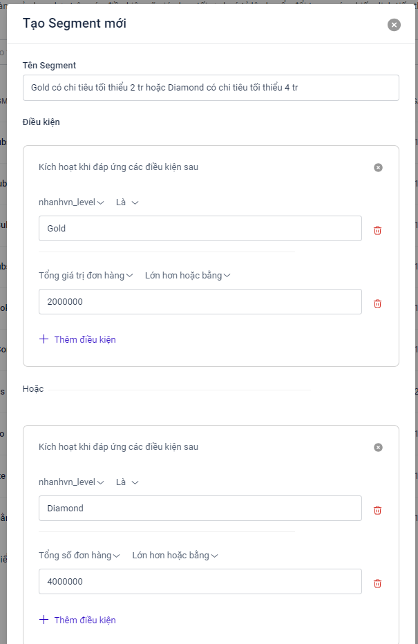 Ở đây, ta thấy có 2 nhóm điều kiện nên cần sử dụng tính năng segment để lọc tập khách hàng. Sau khi thết lập, điều kiện segment sẽ như sau: