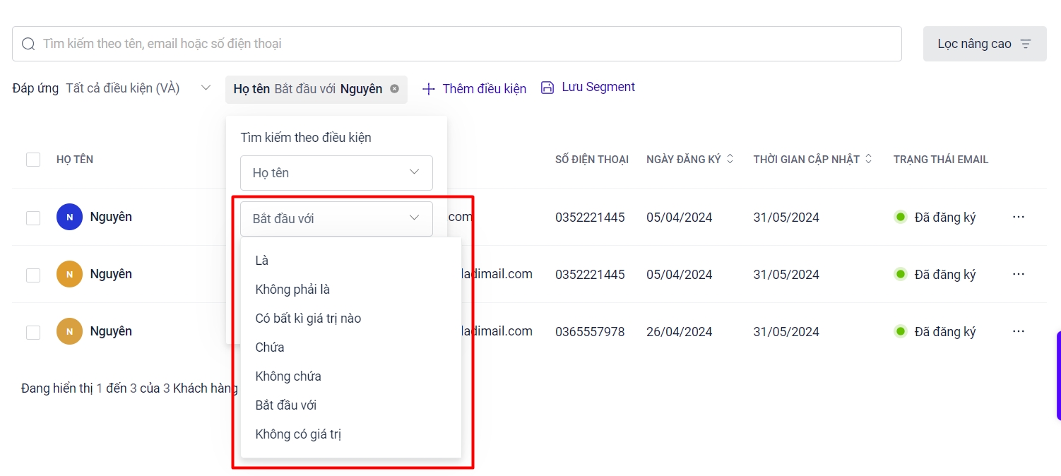 Trả ra kết quả Trường so sánh có giá trị Bắt đầu với Giá trị so sánh. Ví dụ: "Nguyễn Văn A" Bắt đầu với "Nguyễn"=> true "Nguyễn Văn A" Bắt đầu với "Nguyen" =>false "Nguyễn Văn A" Bắt đầu với "Nguy"=>true "Nguyễn Văn A" Bắt đầu với "Nguyễn" =>true