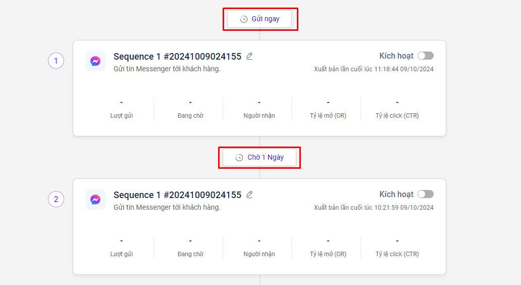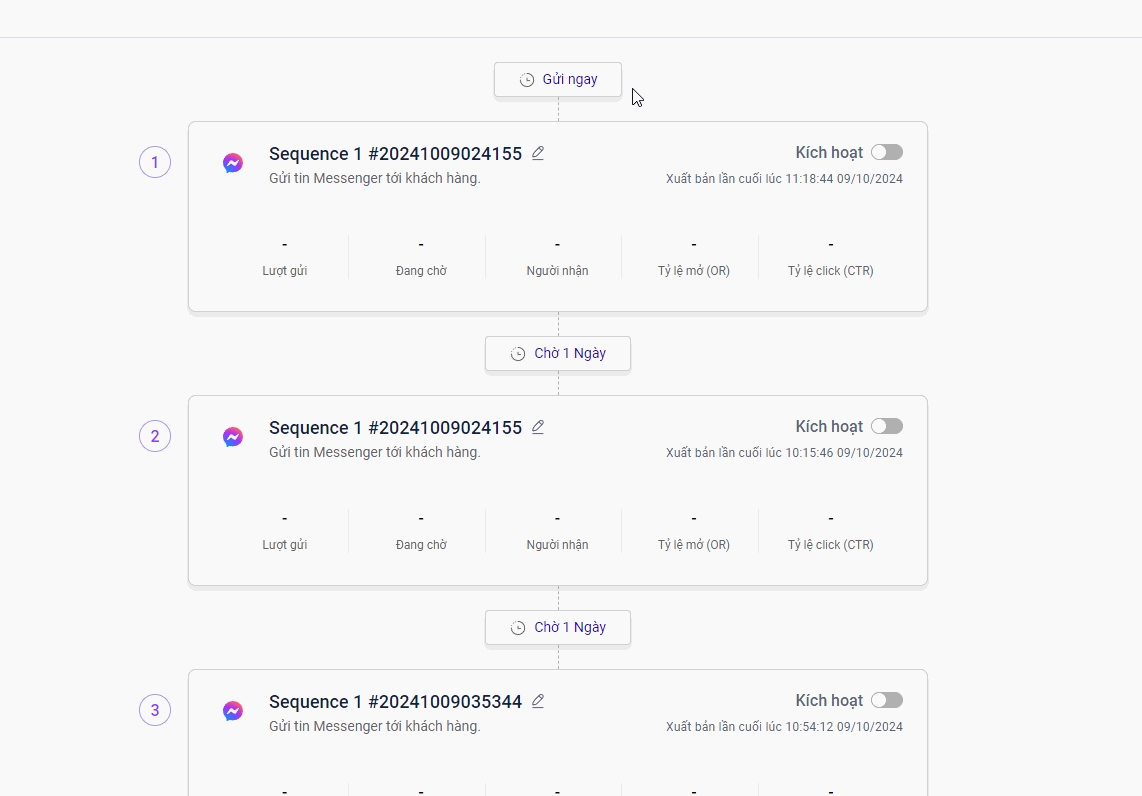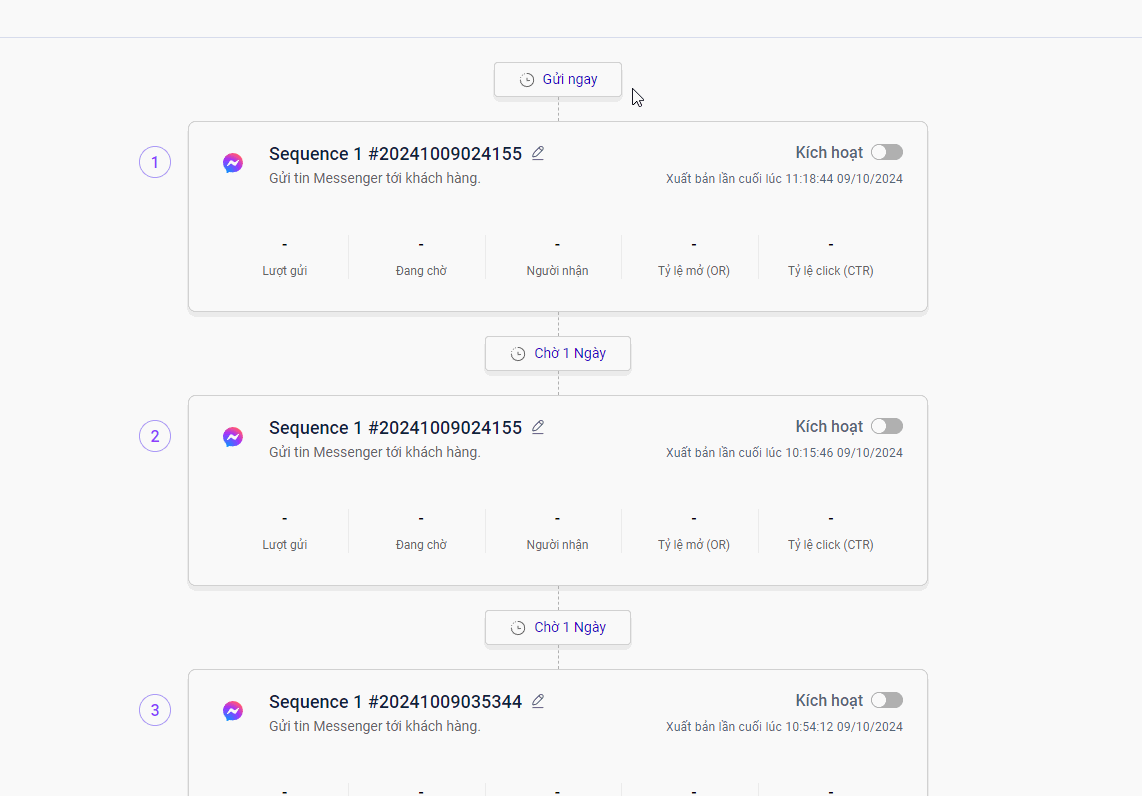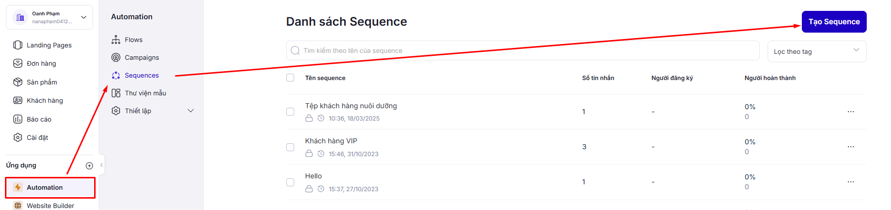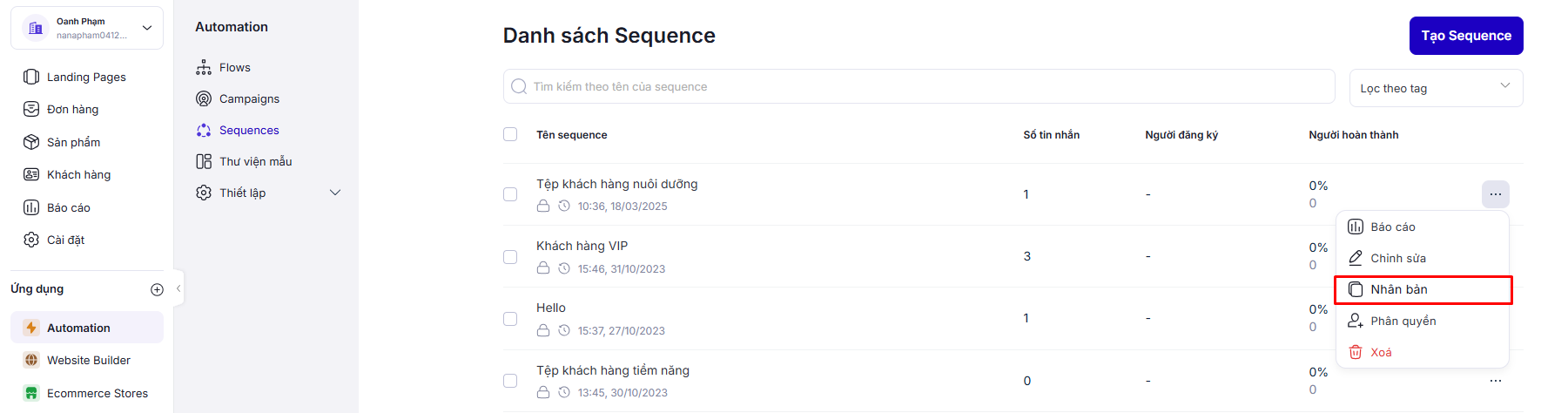 Sequence trên Automation cho phép bạn gửi chuỗi tin nhắn chăm sóc khách hàng theo thời gian được thiết lập.
