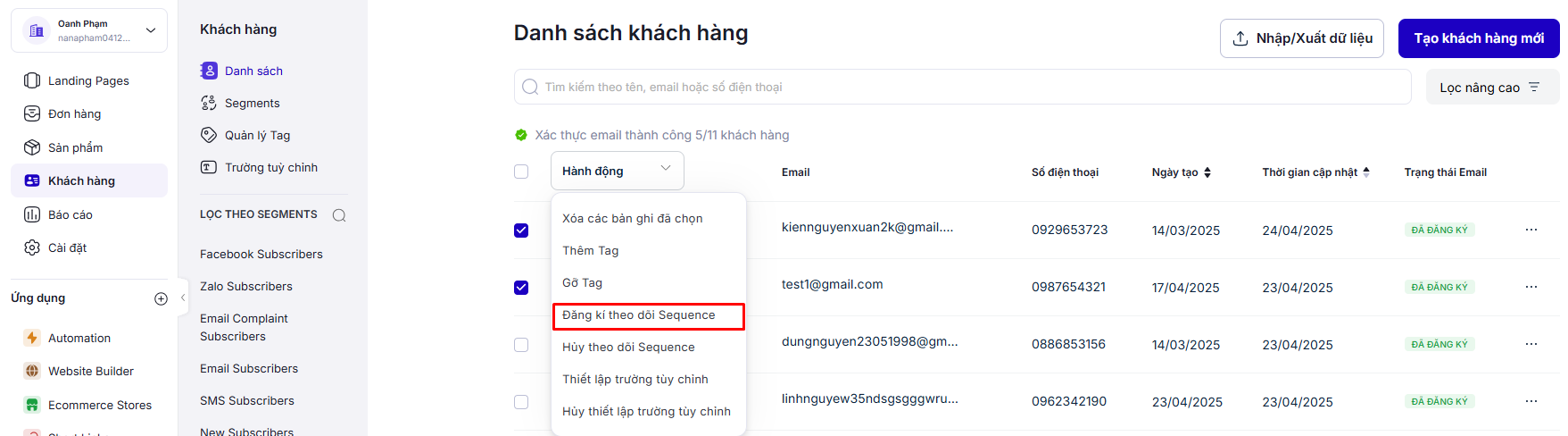2. **Chọn các khách hàng muốn đăng ký Sequence,** sau đó **chọn Hành động, và chọn Đăng ký theo dõi kịch bản.**