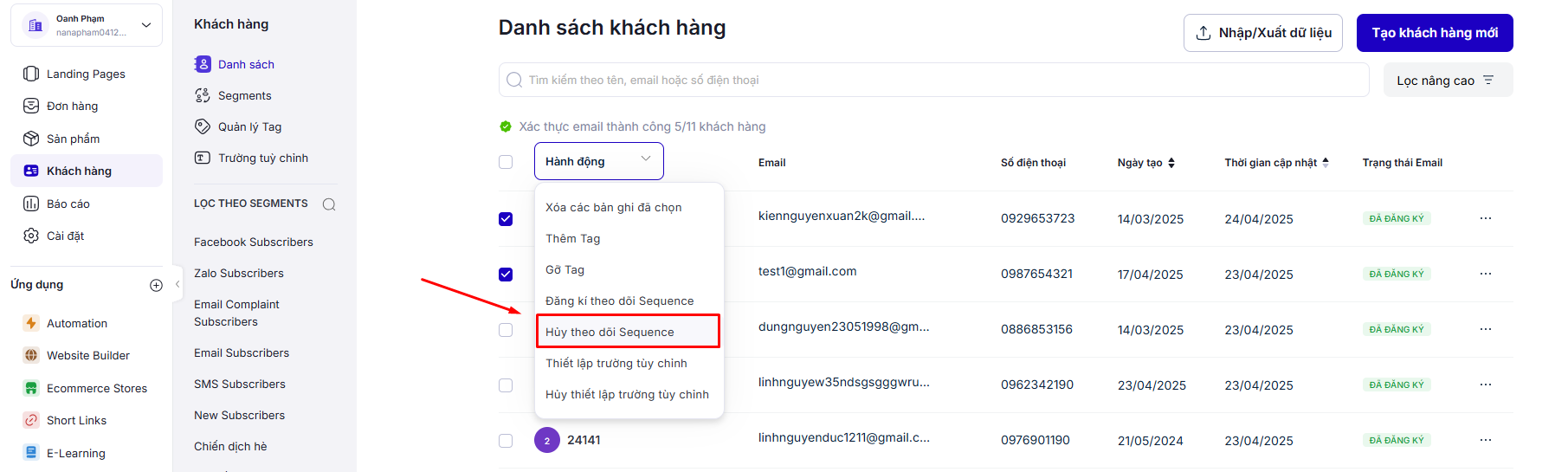 2. **Chọn các khách hàng muốn huỷ đăng ký Sequence,** sau đó **chọn Hành động,** và chọn **Huỷ đăng ký theo dõi kịch bản.**<br>