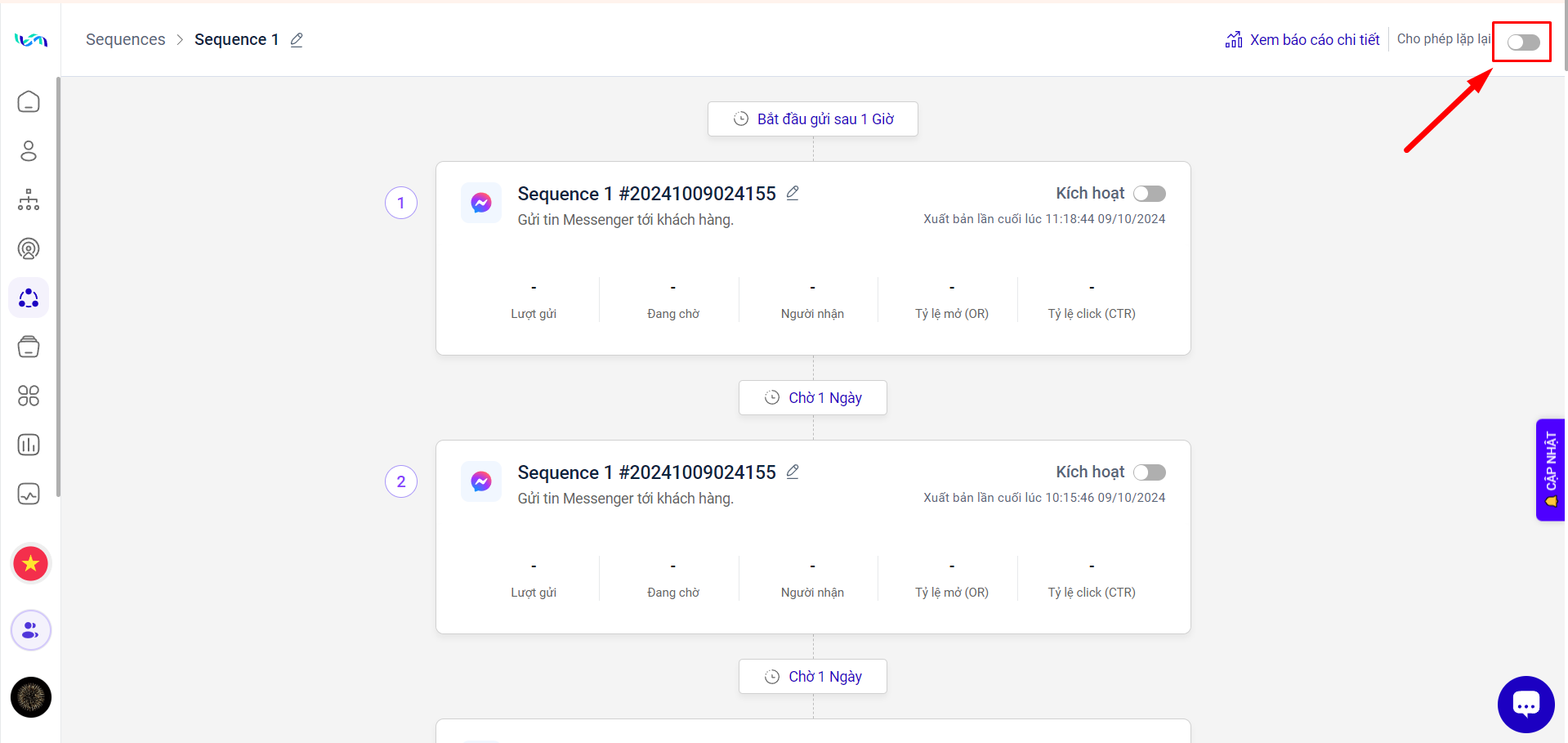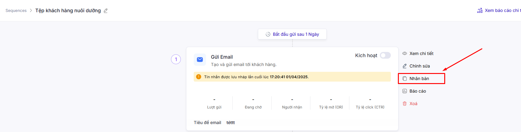 Hệ thống sẽ tạo ra 1 sequence mới có nội dung giống Sequence cũ, bạn có thể chỉnh sửa dữ liệu, xuất bản và kích hoạt tin nhắn.