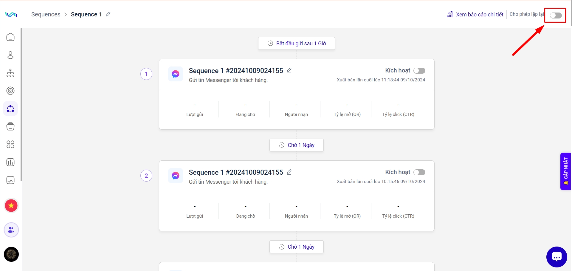 Nếu cho phép Sequence lặp lại, đăng ký lại Sequence với khách đã/đang chạy Sequence thì sau khi kết thúc Sequence sẽ thực hiện lại với khách hàng đó.