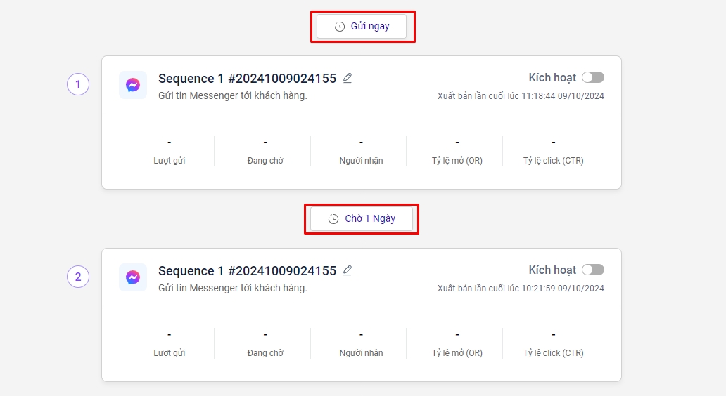 Hệ thống chỉ gửi những tin nhắn được kích hoạt. Các tin nhắn sẽ được gửi theo thời gian thiết lập của nó theo thứ tự từ trên xuống dưới. Thời điểm gửi tin sẽ được tính theo thời điểm tin nhắn gần nhất được xuất bản đã gửi( nếu là tin thứ 2 trở lên), và theo thời điểm đăng ký sequence (nếu là tin nhắn đầu tiên)