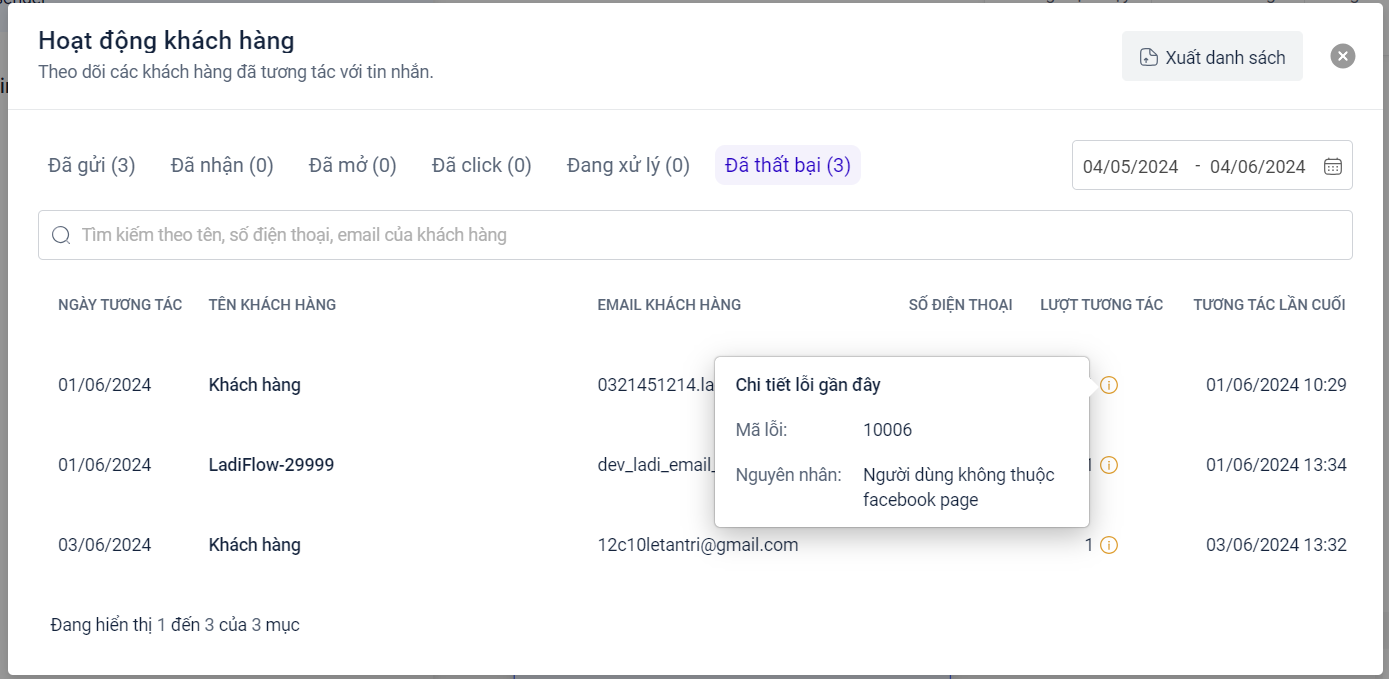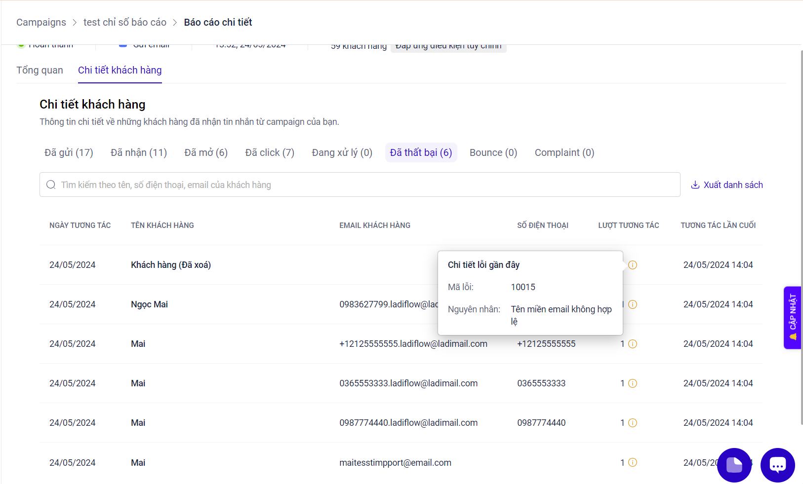 Về nguyên nhân thất bại của từng tin, từng hành động khác nhau. Bạn xem chi tiết lỗi tại Báo cáo Hoạt động khách hàng.