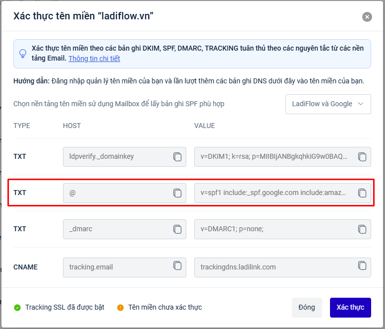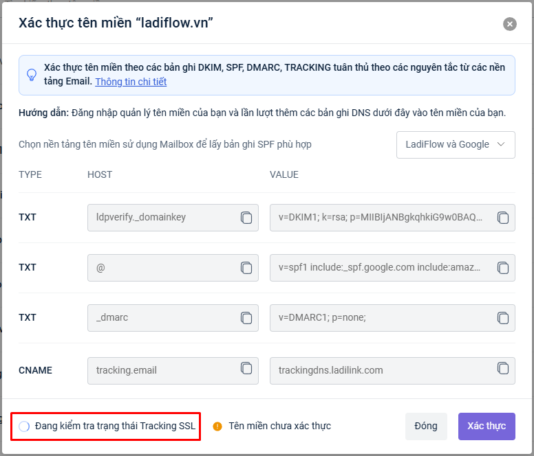 Bạn cần tạo bản ghi DMARC giống như LadiFlow yêu cầu.