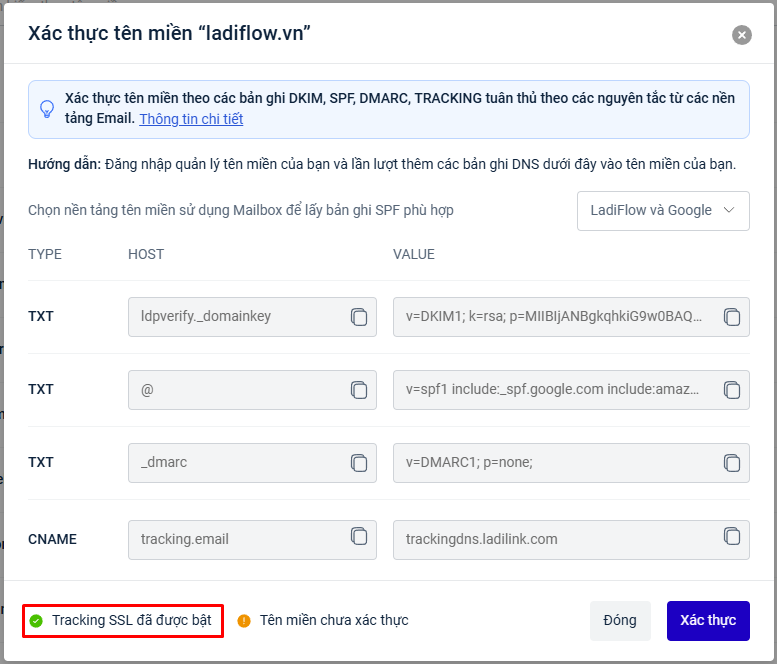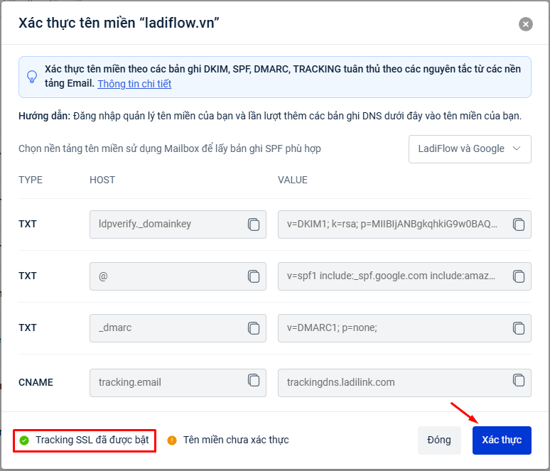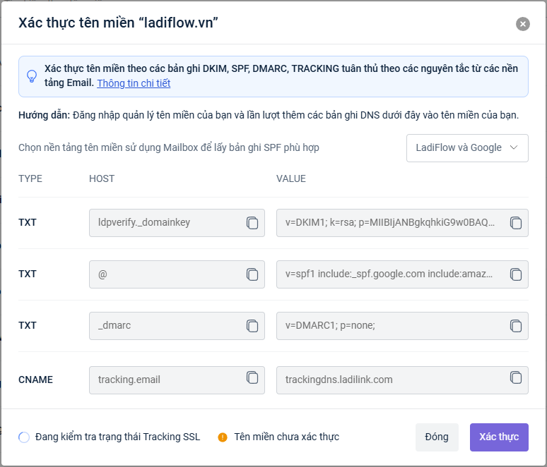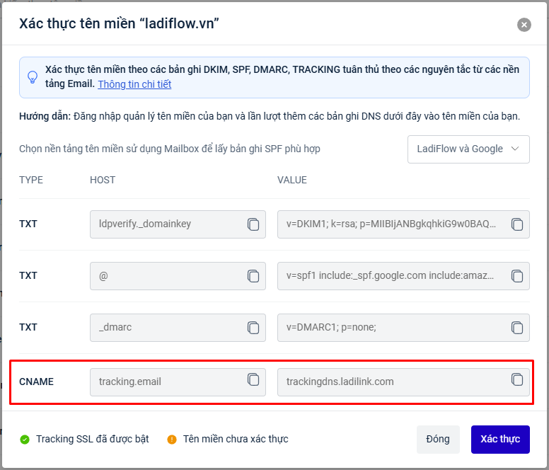 Sau đó tạo bản ghi DNS theo dữ liệu của LadiFlow.