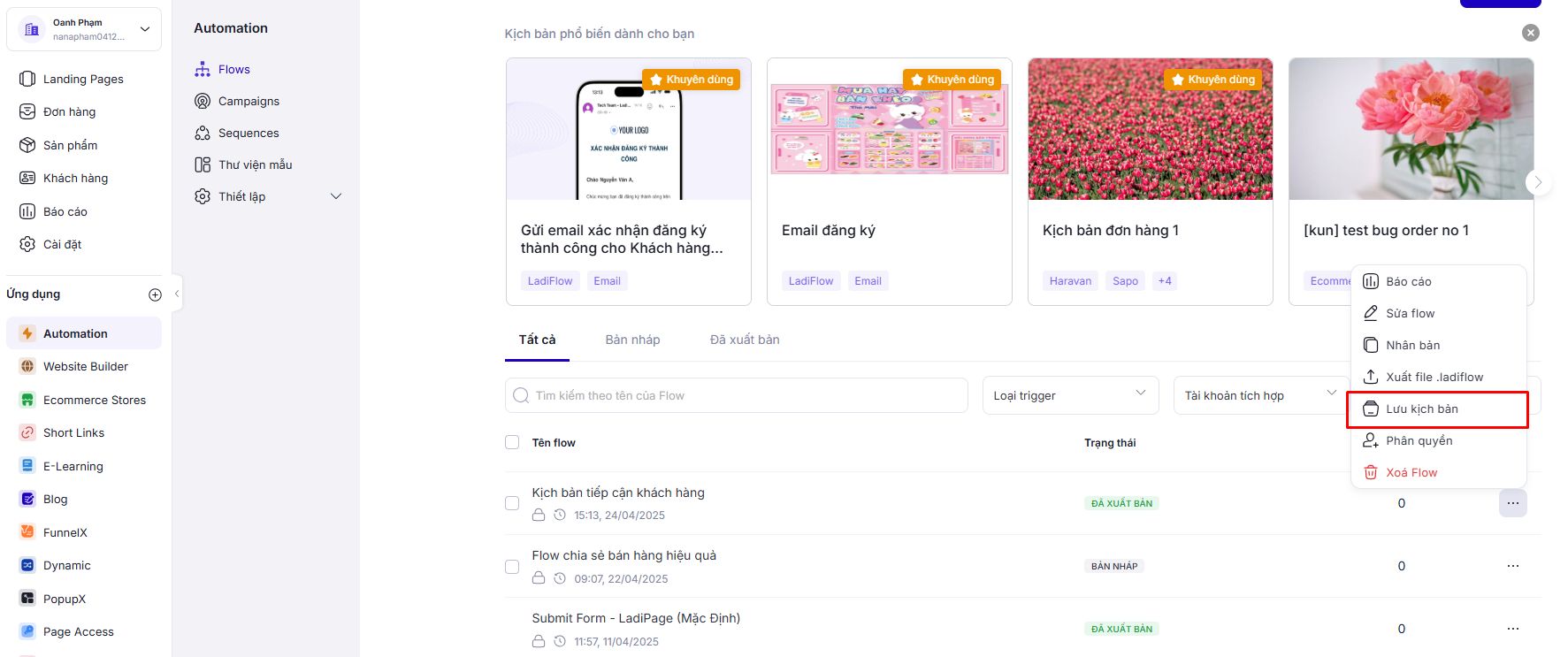 Cách 2: Chọn chức năng sử dụng kịch bản mẫu khi tạo Flow.&#x20;