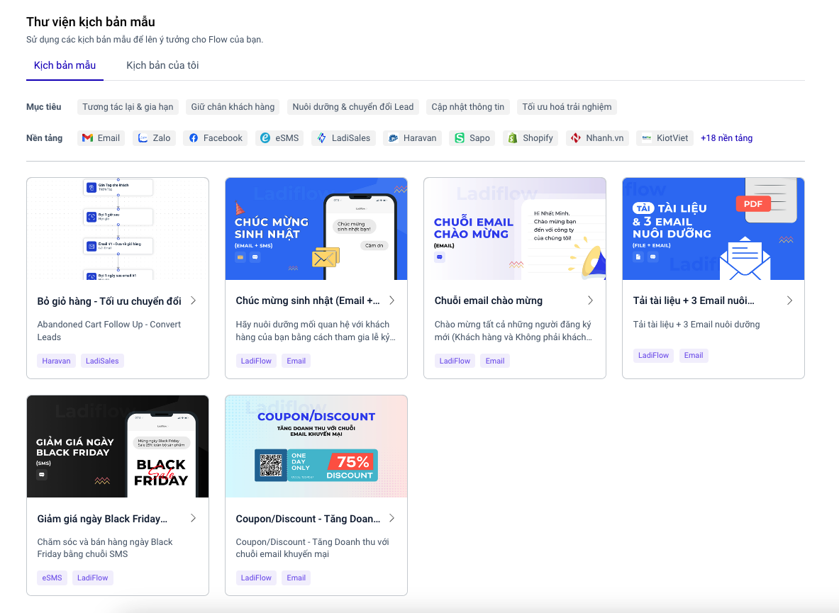 Bạn cũng có thể chọn kịch bản theo nền tảng: Email, Zalo, Messenger..... để tìm ra kịch bản phù hợp.