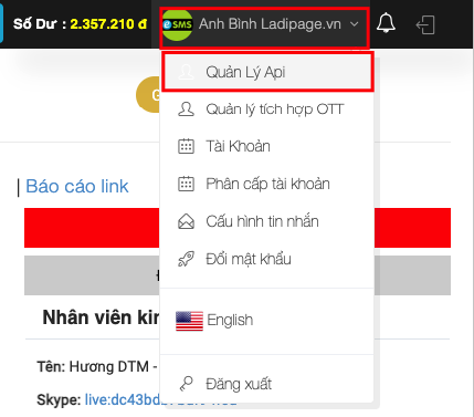 5. Tại trang eSMS, chọn **Quản lý Api** như hình dưới đây: