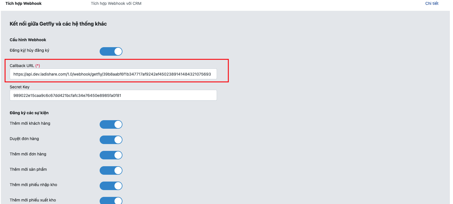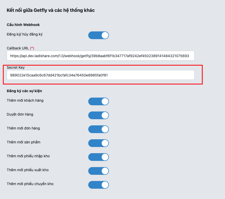 Quay lại Getfly, dán API key vừa copy vào mục Secret Key.