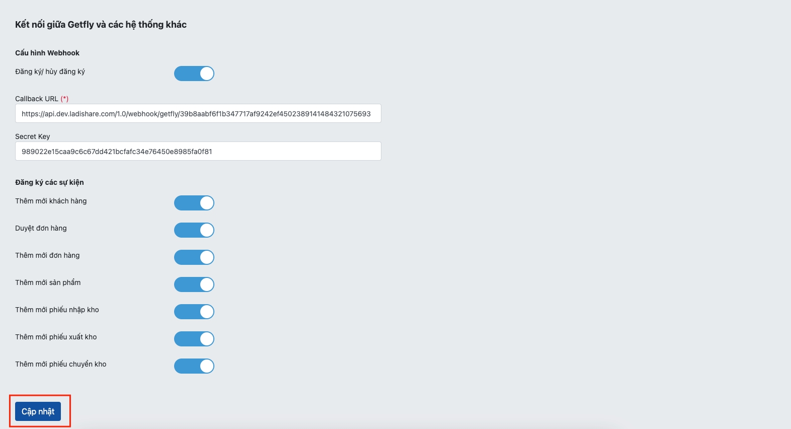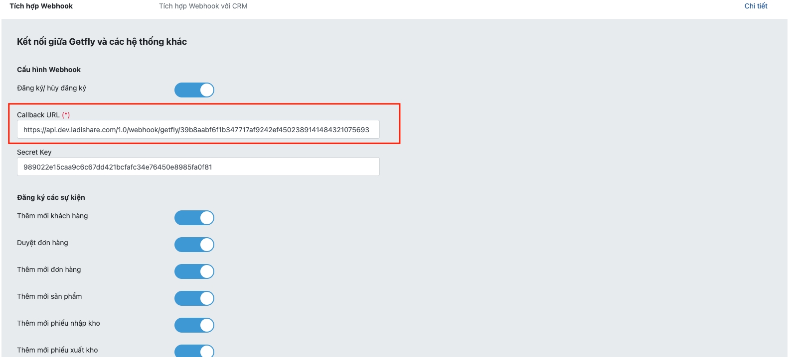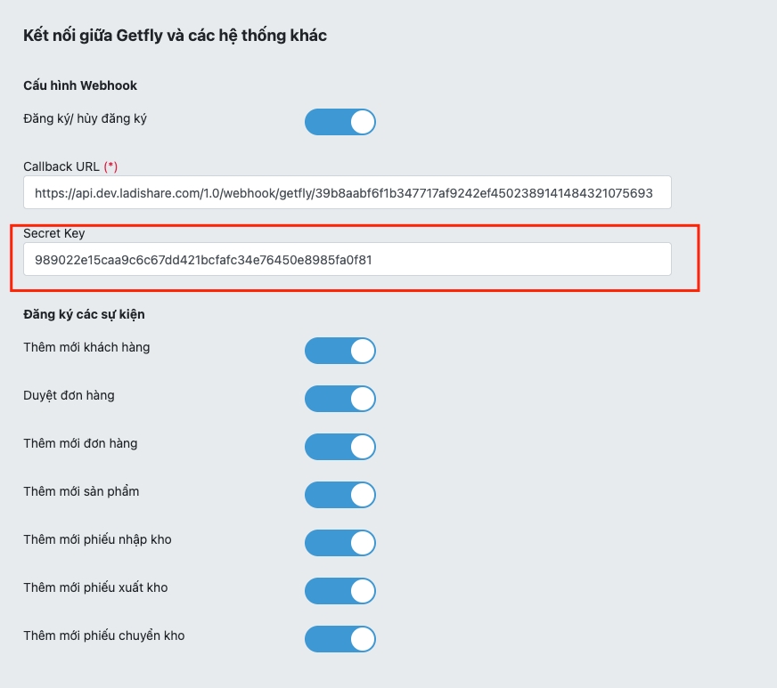 - Quay lại Getfly, dán API key vừa copy vào mục Secret Key.