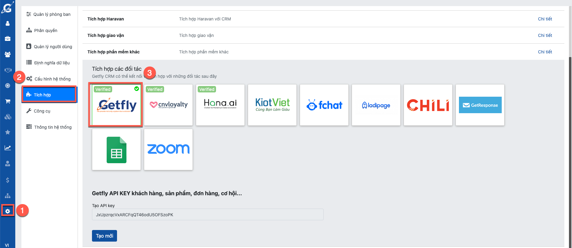 Chọn Cài đặt, chọn Tích hợp, sau đó chọn Tích hợp phần mềm khác. Tiếp theo chọn Getfly.