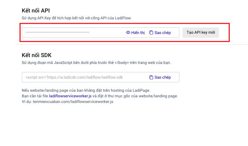 Truy cập LadiFlow, chọn Cài đặt, chọn Tích hợp. Sao chép API key.