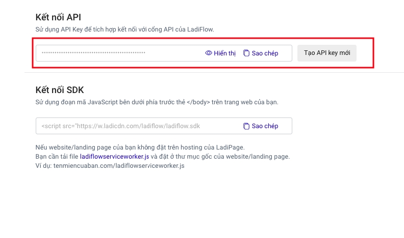 - Truy cập LadiFlow, chọn Cài đặt, chọn Tích hợp. Sao chép API key.