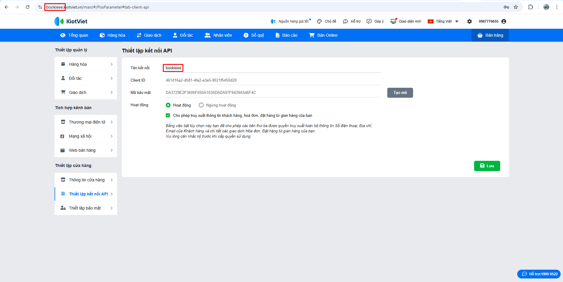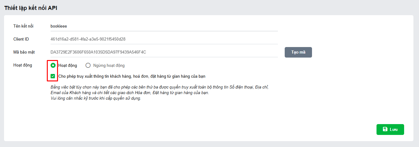 Tích vào Hoạt động và Cho phép truy xuất thông tin khách hàng, hoá đơn, đặt hàng từ gian hàng của bạn;