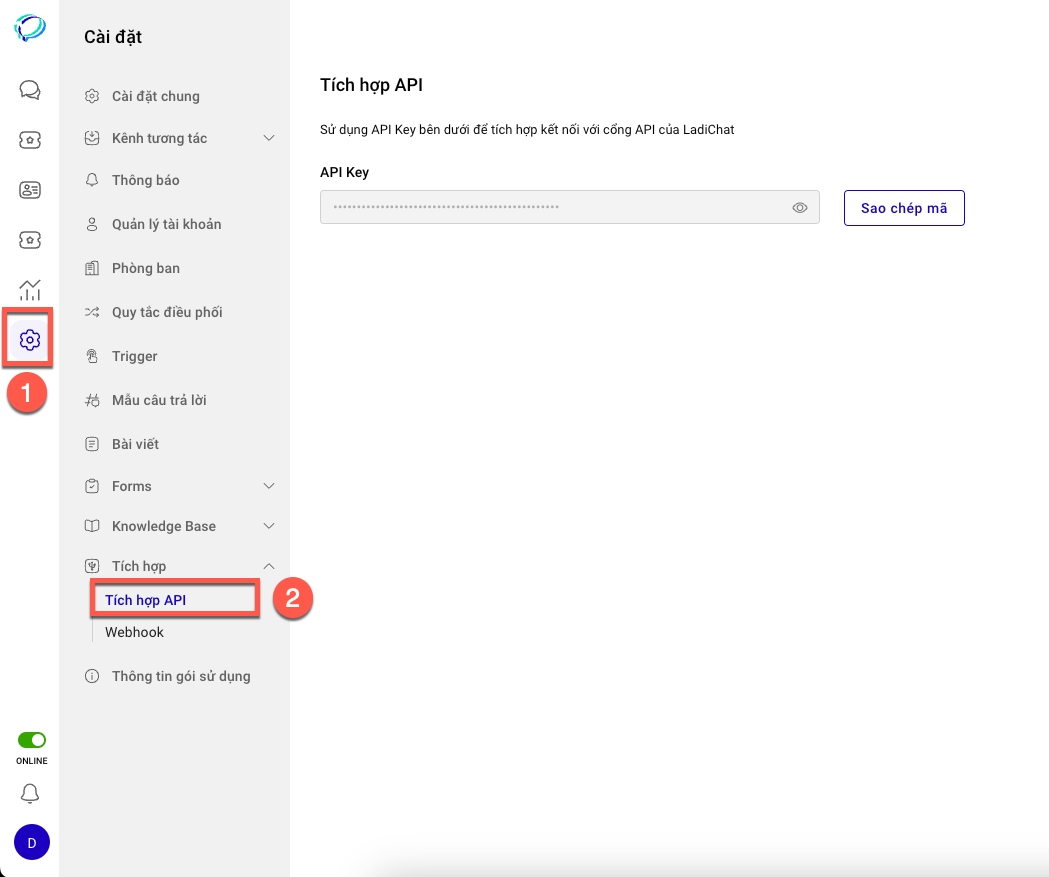 - Truy cập Cài đặt, sau đó chọn Tích hợp. Copy API key tại mục Kết nối API.