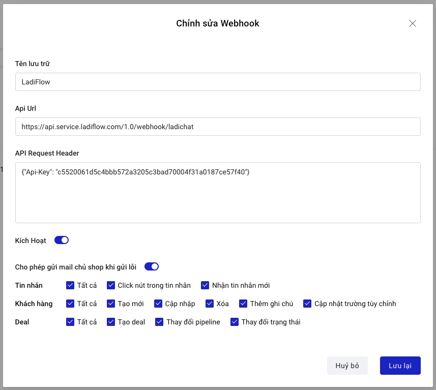 - API Request Header có format như sau: {"Api-Key": "api key bạn vừa copy trên LadiFlow"}