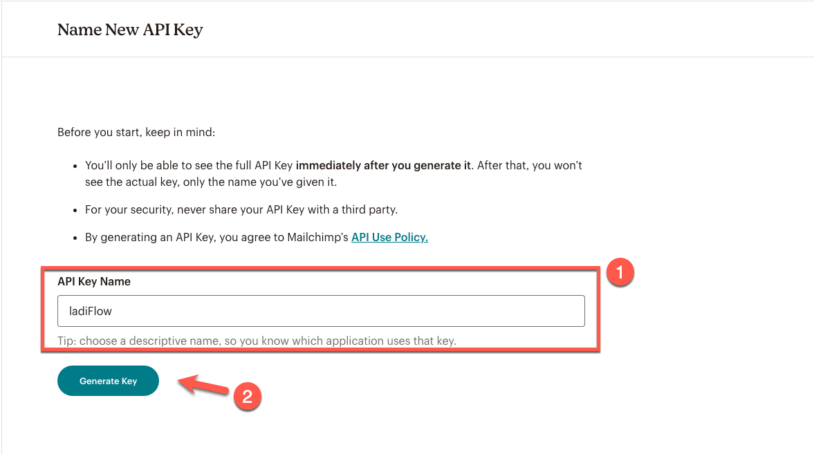 Điền API key name và chọn Generate Key.