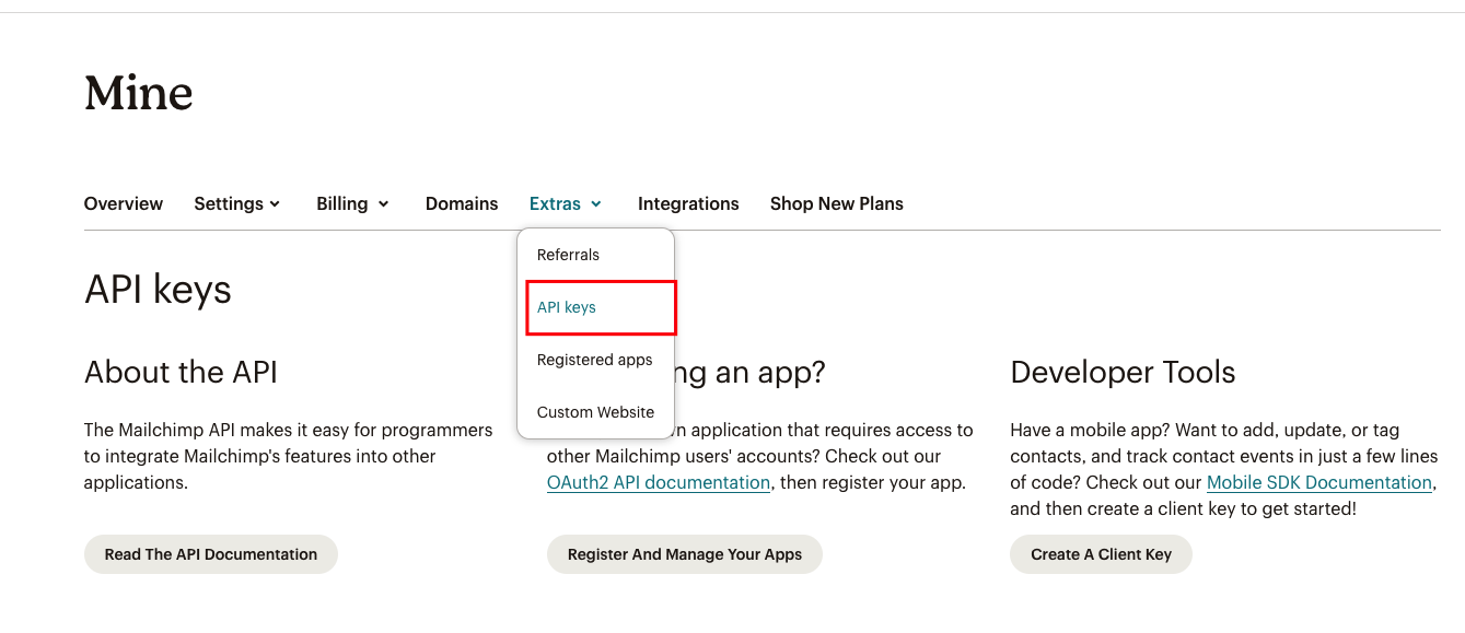 Chọn Extras,sau đó chọn API key.