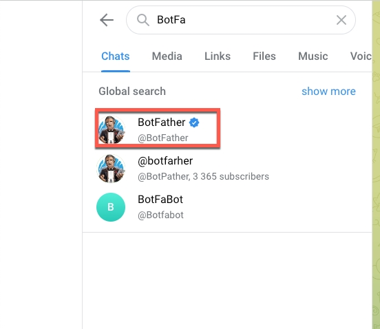 - Mở ứng dụng Telegram, tìm kiếm BotFather.