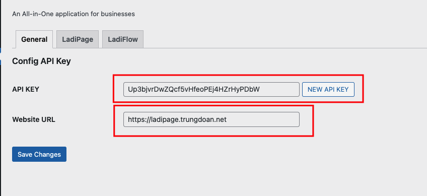 Trên Wordpress, chọn LadiApp. Copy API Key, Website URL lần lượt paste vào API Key và API URL trên Form lưu liên kết trên Automation. Chọn Save changes trên wordpress để lưu dữ liệu.