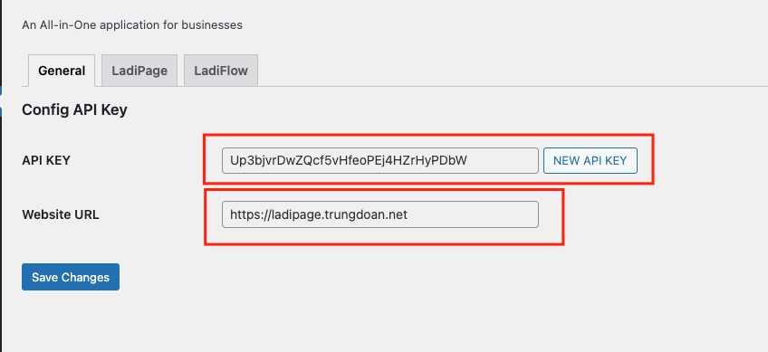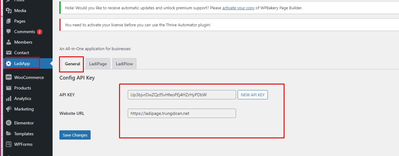 - Trên Wordpress, chọn LadiApp. Copy API Key, Website URL lần lượt paste vào API Key và API URL trên Form lưu liên kết trên Automation. Chọn Save changes trên wordpress để lưu dữ liệu.