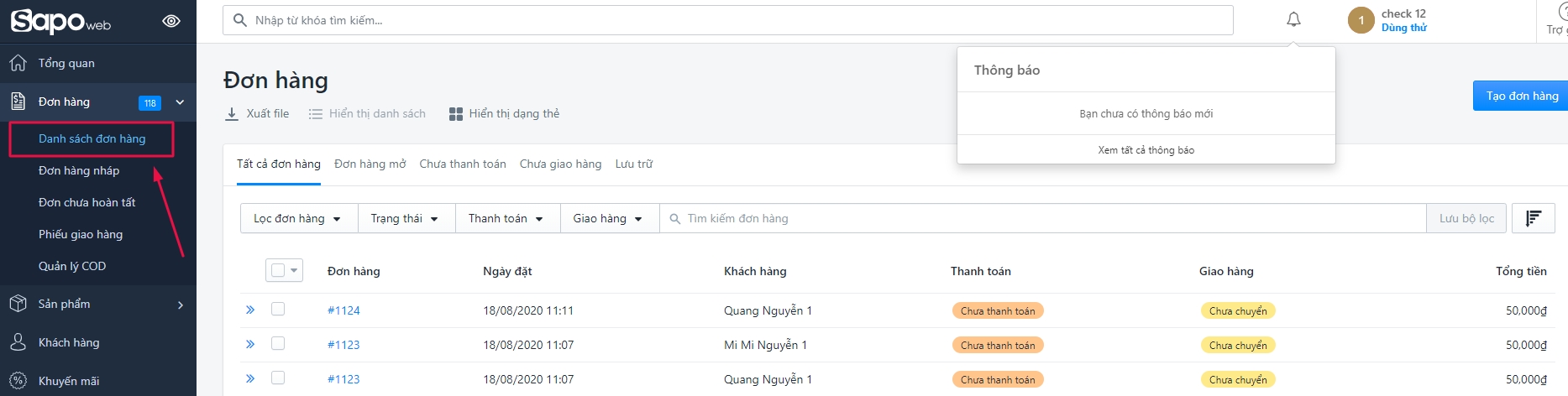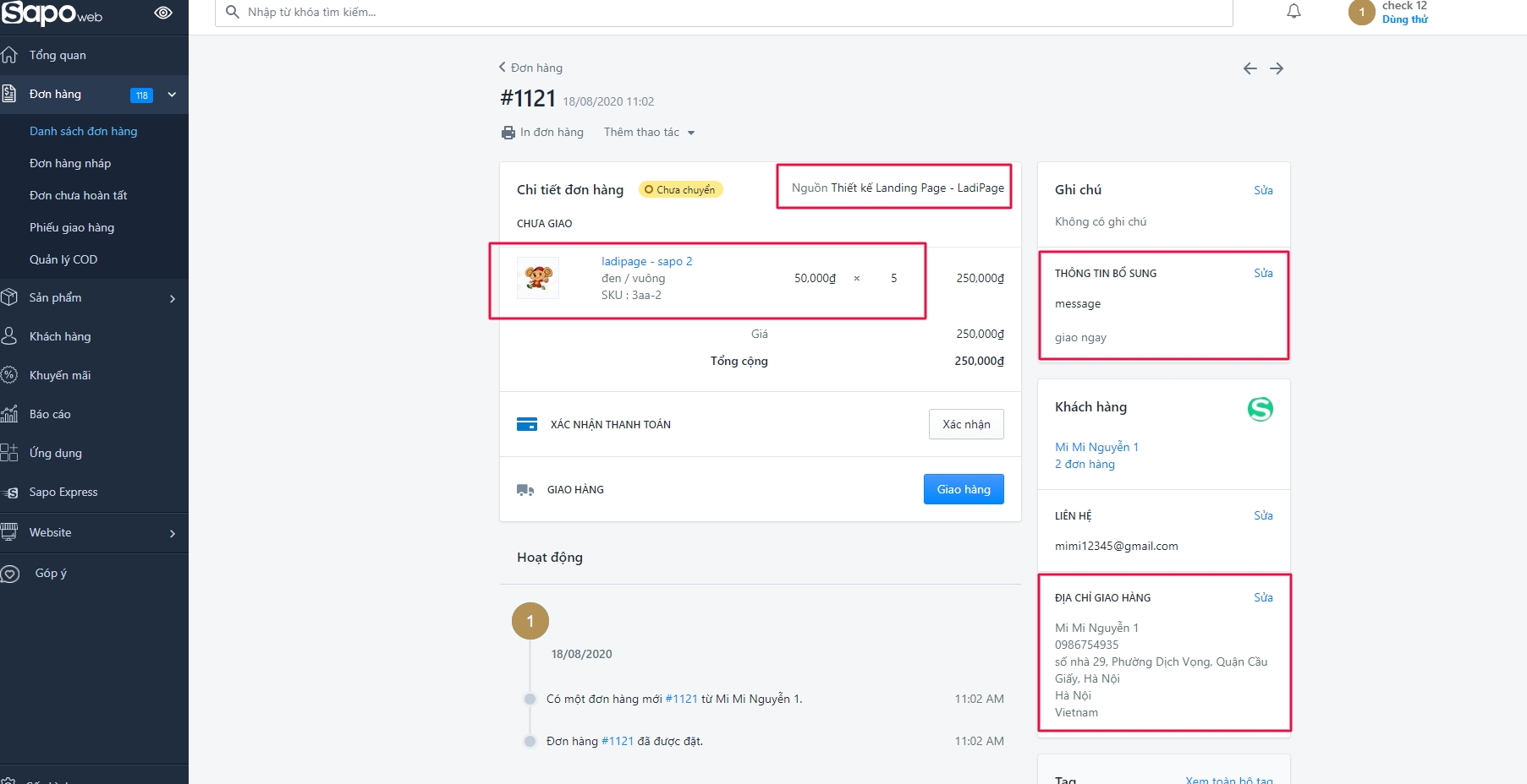Vậy là bạn đã hoàn thành việc gửi đơn hàng từ Landing Page sang mục Đơn hàng trên Sapo.
