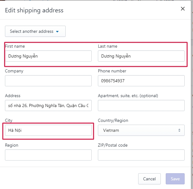 Lưu ý: Đối với trường thông tin giao hàng (shipping address) thì phần First Name và Last Name sẽ bị lặp lại trùng nhau, và thông tin địa chỉ sẽ chỉ thêm được vào mục Address và City.