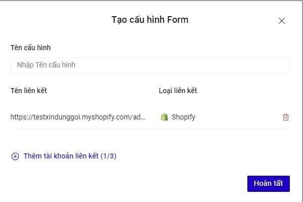 Truy cập trang builder.ladipage.com, chọn menu Landing Pages -> Cấu hình form-> Tạo cấu hình form -> Form data -> Tạo tài khoản liên kết .Sau đó lựa chọn Loại tài khoản là Shopify.