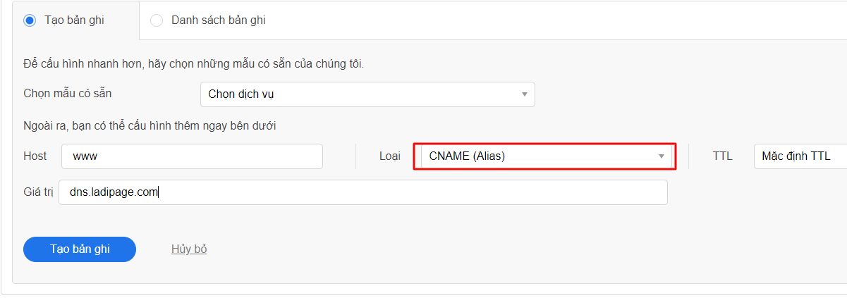 Host record: www Type (Loại): CNAME Value (Giá trị): dns.ladipage.com