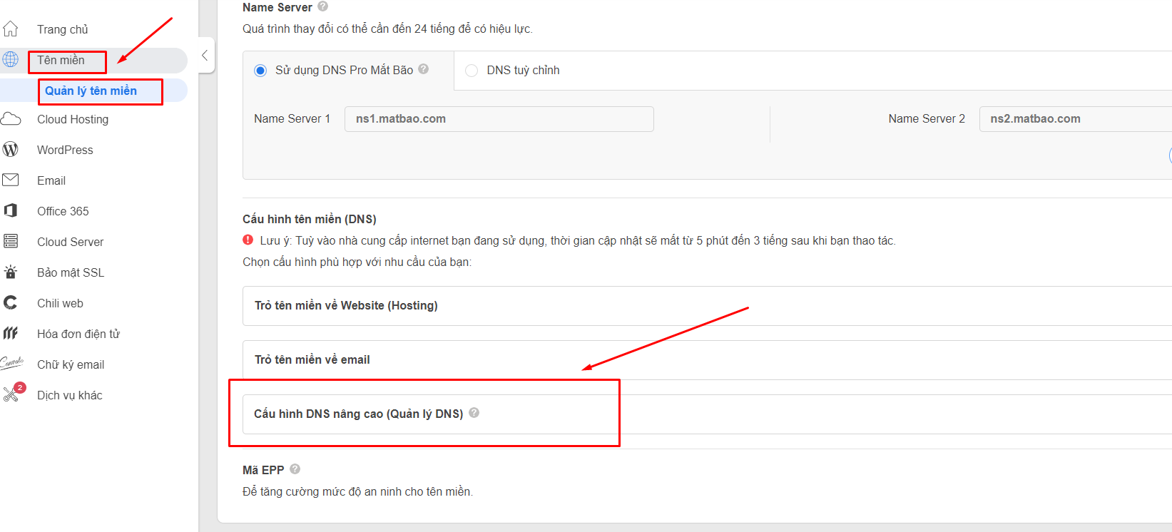 Bạn truy cập tài khoản Mắt bão--> chọn Tên miền --> Quản lý DNS để tạo bản ghi tên miền.