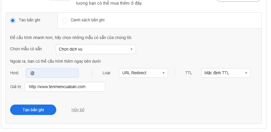 Host record: @ Loại: URL Redirect Giá trị): http://www.tenmiencuaban.com Lưu ý: Thay tenmiencuaban.com thành tên miền bạn đang cấu hình.