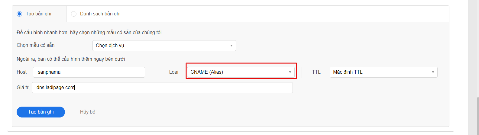 Giả sử tên miền chính của bạn là tenmiencuaban.com, và bạn muốn tạo một tên miền phụ là sanphama.tenmiencuaban.com. Chọn tên miền chính bạn muốn cài đặt, sau đó tạo một bản ghi mới và điền các giá trị như sau: Host record: sanphama Type (Loại): CNAME Value (Giá trị): dns.ladipage.com