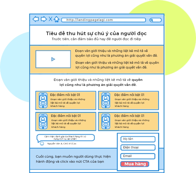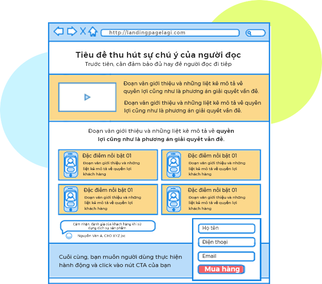 Với Landing Page thu thập thông tin hoặc trung gian chuyển đổi thì section intro là quan trọng nhất, ta có thể đưa ngay offer và form đăng ký ở đầu. Nhưng với Landing Page bán hàng, hỏi luôn thông tin khách hàng ở section đầu tiên có vẻ hơi vội vàng, ta cần cho họ biết nhiều thông tin hơn trước khi đưa ra quyết định. Vì vậy đối với Landing Page bán hàng, chúng ta sẽ áp dụng công thức AIDA để diễn giải nội dung, lúc này CTA cũng như form đăng ký sẽ đặt ở cuối trang, sau khi người xem đã đi qua một dòng câu chuyện của chúng ta.