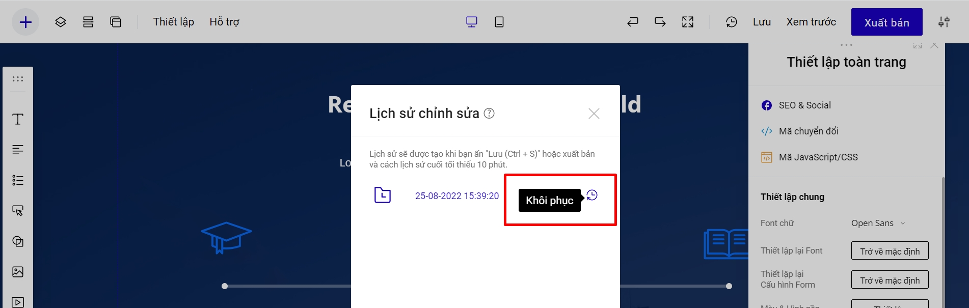 Bạn khôi phục lại bản landing page đã chỉnh sửa bằng cách sau: