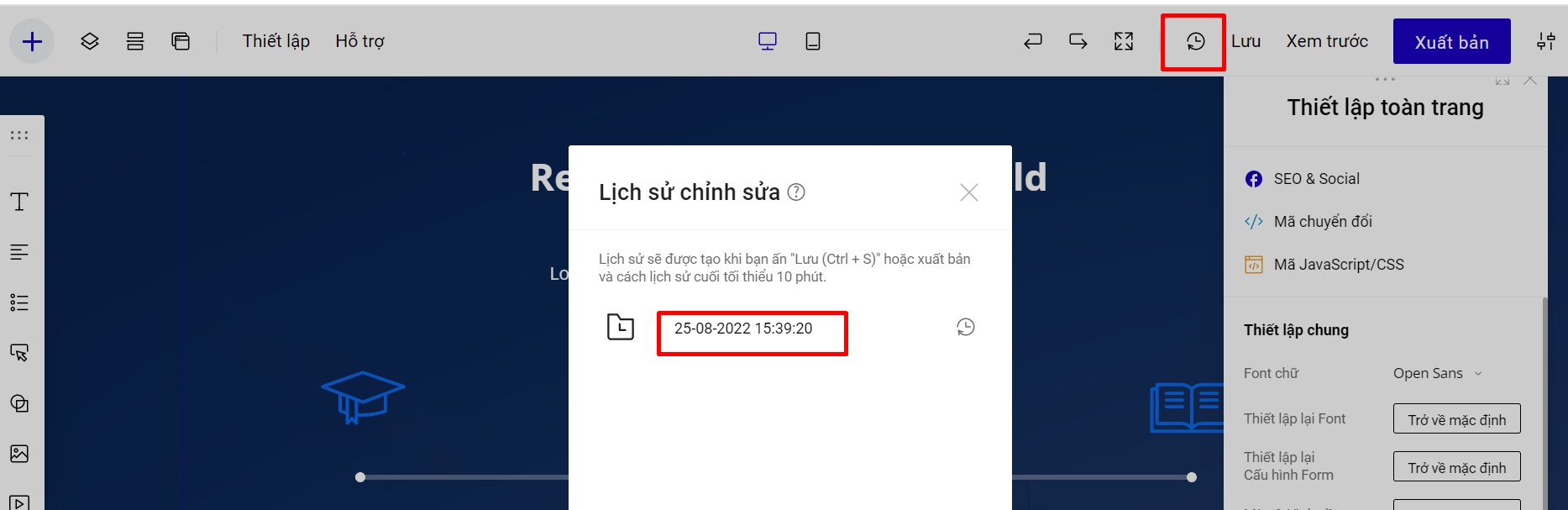 Một lịch sử chỉnh sửa sẽ được tạo khi bạn bấm "Lưu" hoặc bấm Xuất bản. Hệ thống lưu các lịch sử chỉnh sửa cách nhau tối thiểu 10 phút (Có nghĩa là: nếu bạn vừa lưu landing page lúc 10h, thì trong lịch sử chỉnh sửa sẽ có phiên bản lúc 10h. Nếu bạn tiếp tục lưu landing page lúc 10h5' thì phiên bản lúc 10h5' sẽ không được lưu).